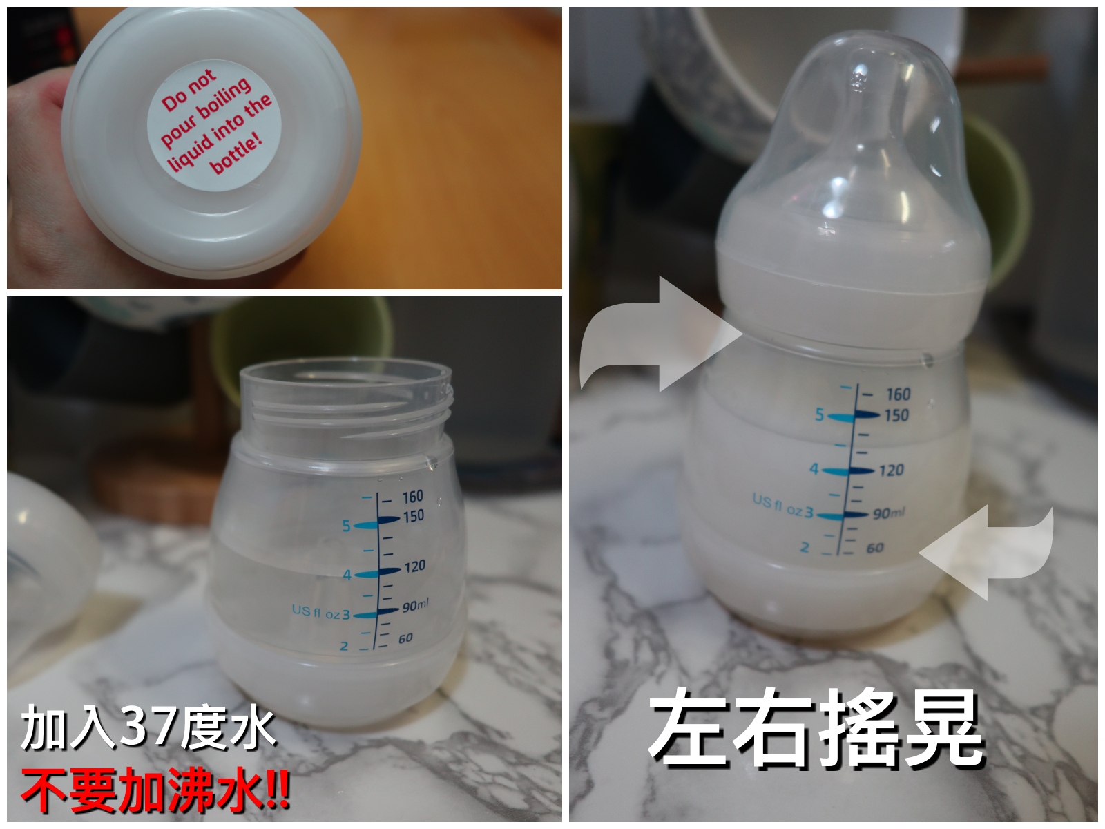 然後再加入奶粉,而沖調奶粉只需要拿起瓶左右搖晃便可!