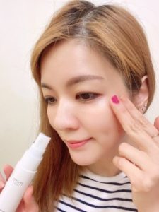 潔膚後,取3泵 (每邊眼睛) 精華液由外向內均塗於各眼下位置,