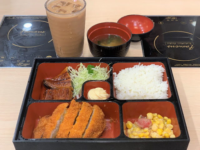 吉列豬扒+蒲燒饅魚弁当,一個餐有兩款味美主食,外層炸得金黃的吉列豬扒,十分香脆,肉質也鮮嫩甘香;饅魚的份量雖然不算多,只有兩小片,不過饅魚肉肥油香,口感嫩滑,配上香濃鰻魚燒汁,蠻不錯喔!