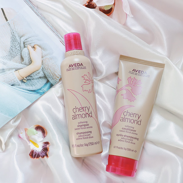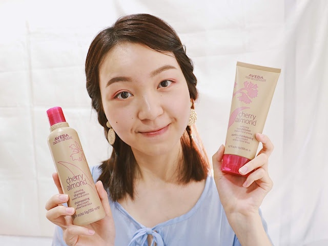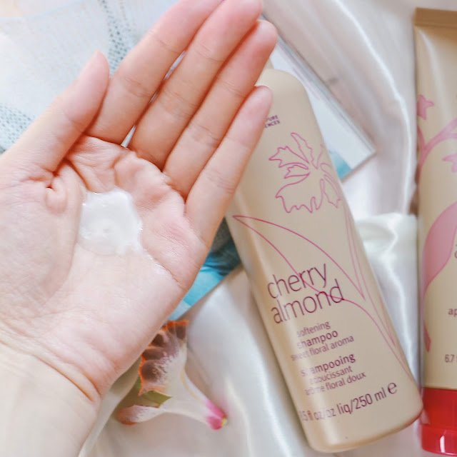 幸福甜美香氣 CherryAlmond 櫻花甜杏輕柔系列,杏仁的香氣很突出,甜甜的,杏仁能有效滋潤修護髮絲,我自己最喜歡就是這個,即時軟化柔順頭髮,防止打結,像我經常會染髮或者經常燙髮電髮就很適合使用這個啦。