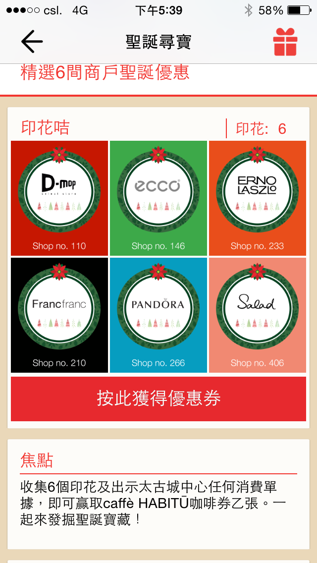 訪客只需下載「Cityplaza Xmas」應用程式到智能手機,並於即日起至2015年1月1 日期間,分別成功找到分佈於太古城中心場內的6個印花站,可即時得知商戶的最新資訊及相關聖誕尊享優惠!