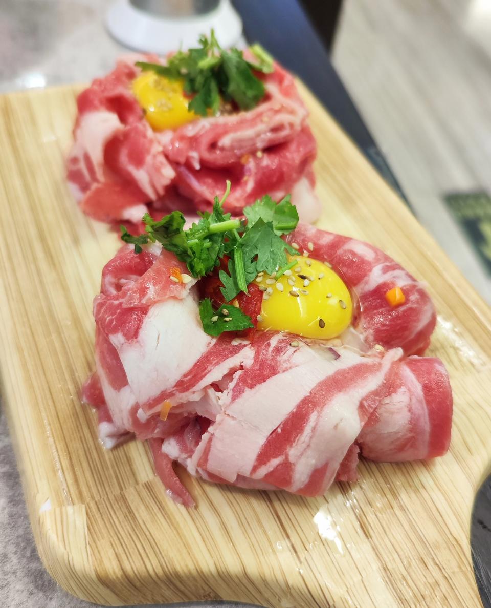 鮮潭撈拌肥牛店員先幫忙把肥牛拌上雞蛋🐂