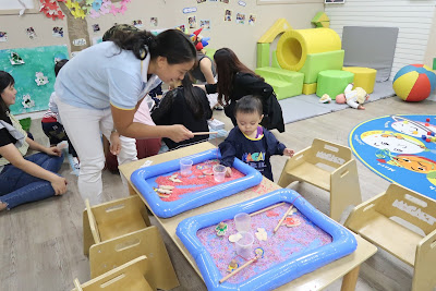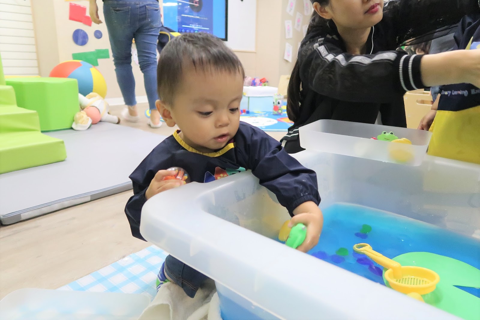 接著是孩子們最興奮的遊戲時間,老師安排了三個活動,分別有玩顏料,玩水及釣魚遊戲,都是有助刺激感官的遊戲。