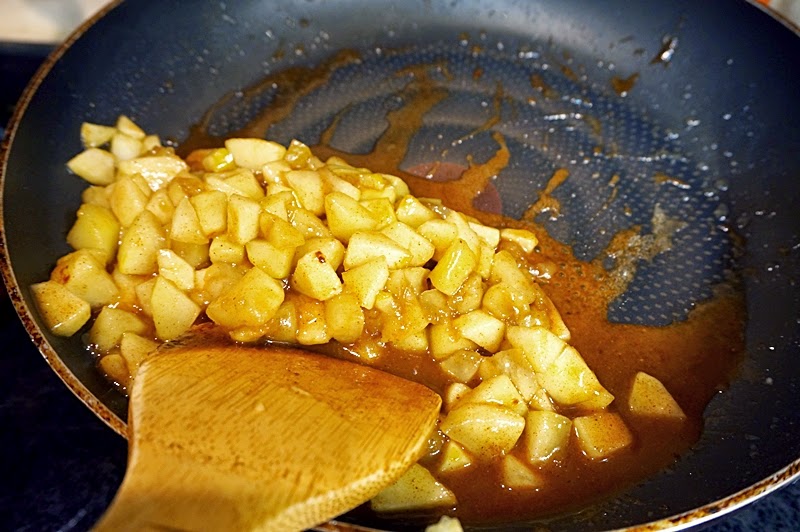 做法: 用慢火煮溶牛油, 加入蘋果粒和砂糖煮稔, 適量加少許水避免蘋果燶, 煮約15分鐘後加入玉桂粉和檸檬汁拌勻即成.
