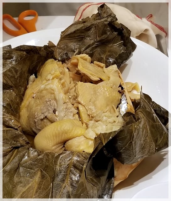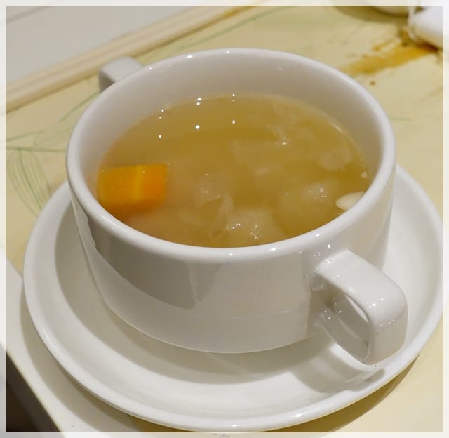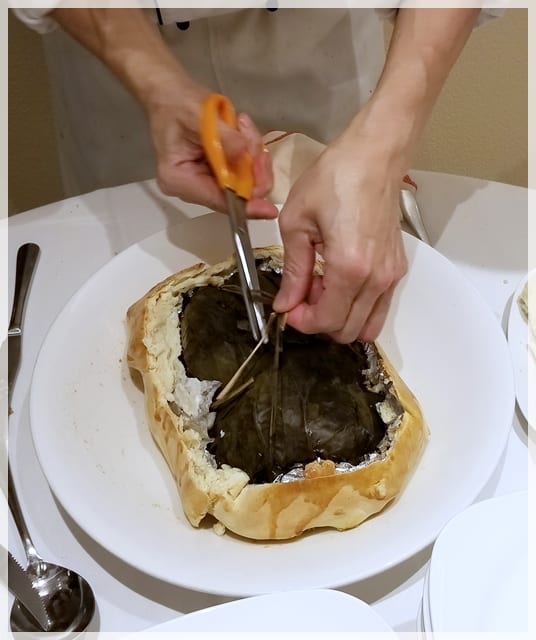 這晚有工序繁複的富貴雞,外層是烤麵糰,揭開錫紙及荷葉後,是被豬網油包裹著的雞隻,再剪開雞身,裡面有花膠、瑤柱、花菇等餡料,雞肉吸收了各配料的味道,口感幼嫩,味道豐富。
