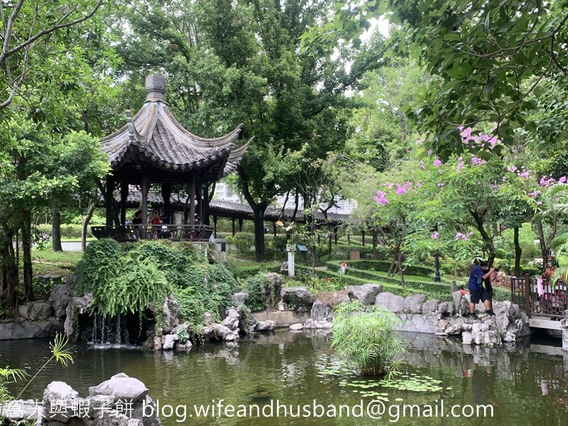 涼亭和水池配上綠葉紫花,構圖豐富。