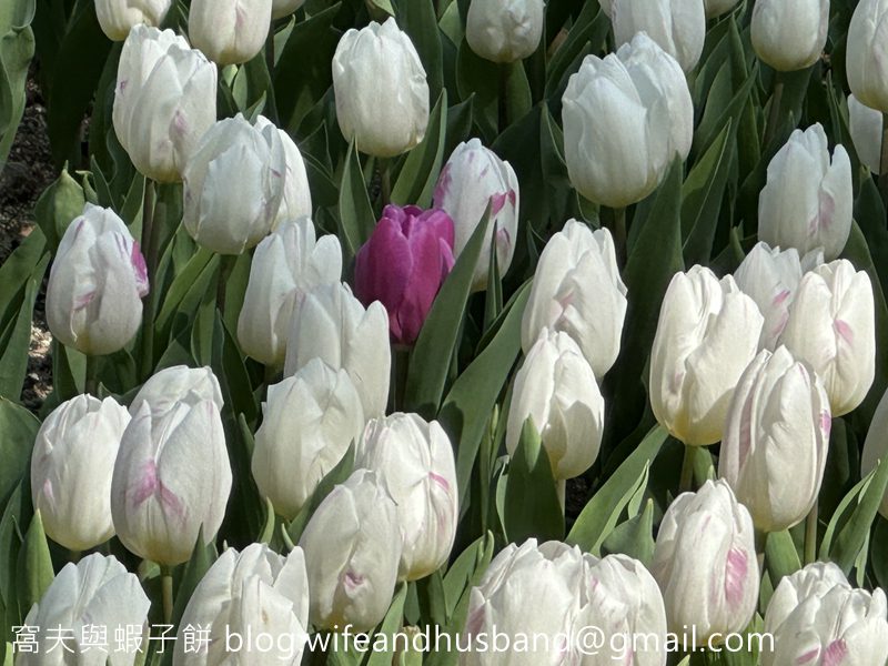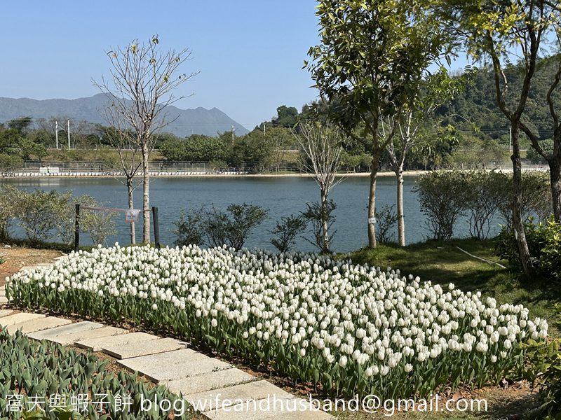 以八仙嶺為背景的白色鬱金香花圃。