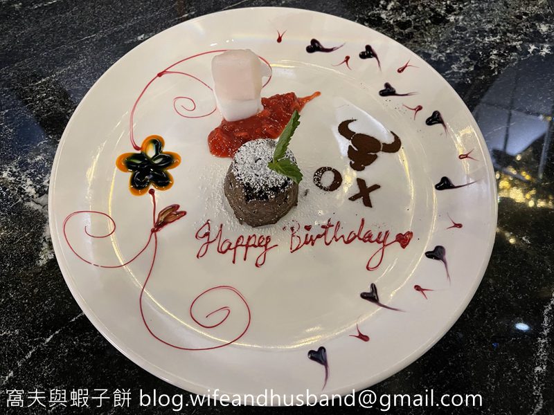 最後是甜品時間,寫上「生日快樂」的頂級比利時心太軟當然要相機食先。久違的心太軟非常好吃,表層夠脆,入面夠流心,朱古力味香濃,不會太甜,旁邊有兩粒雪葩,一粒桃味一粒檸檬味,檸檬味較出色。