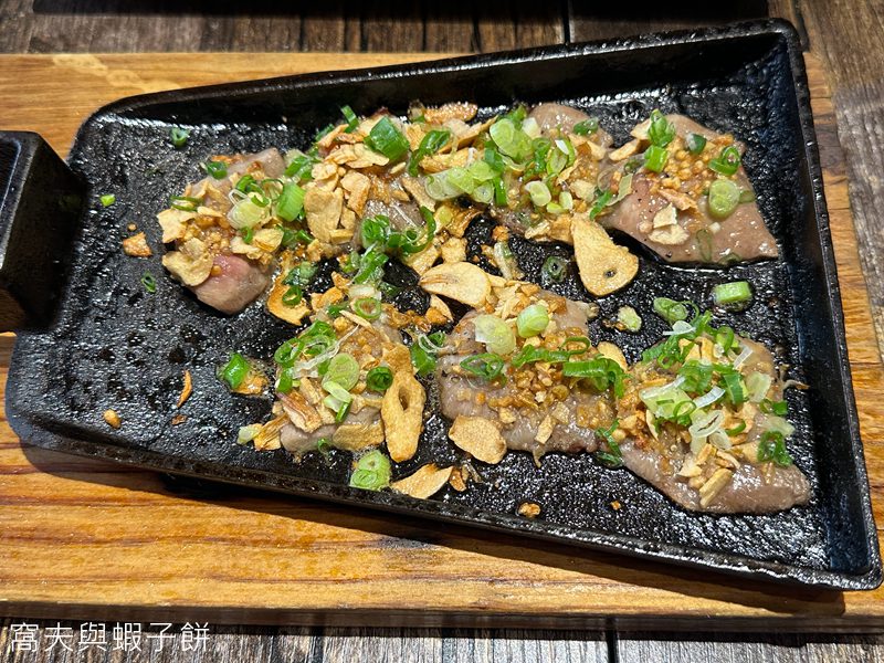 牛舌薄燒以鐵板上桌,保持熱度,薄切的牛舌爽而不靭,配上大量蔥蒜,非常惹味。